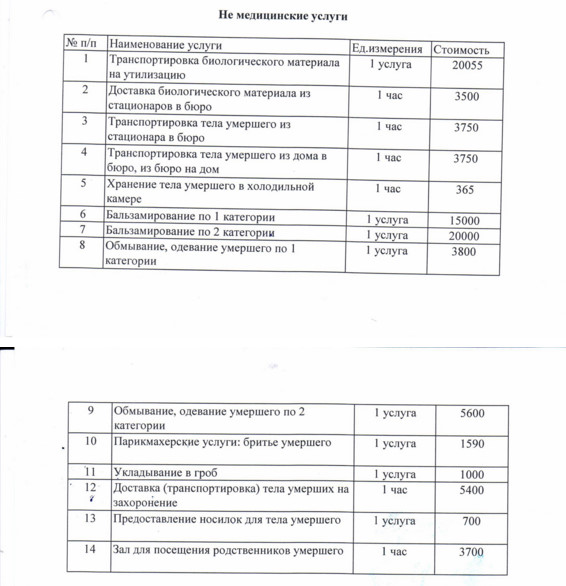К слову, патологоанатомическое бюро - это не только морг, где производится хранение тел и вскрытие трупов для установления причин смерти. Здесь также осуществляется и работа со, скажем так, живыми людьми - в местных лабораториях проводят гистологические исследования образцов тканей, взятых из организма человека (в частности, применяется в диагностике злокачественных опухолей). С прейскурантом предприятия можно ознакомиться здесь. Список платных услуг включает в себя 14 пунктов. Например, патологоанатомическое вскрытие стоит 32 970 тенге. Хранение тела умершего в холодильной камере - 365 тенге в час. Бальзамирование - 15 и 20 тысяч в зависимости от категории. А укладывание в гроб стоит 1000 тенге.