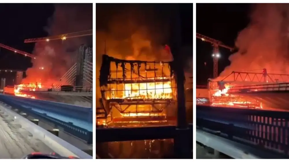 Как сообщили в пресс-службе МЧС, сразу после сообщения о пожаре к объекту выдвинули пожарные расчеты. Горели утеплитель и деревянные элементы опалубки на четвертой опоре моста.