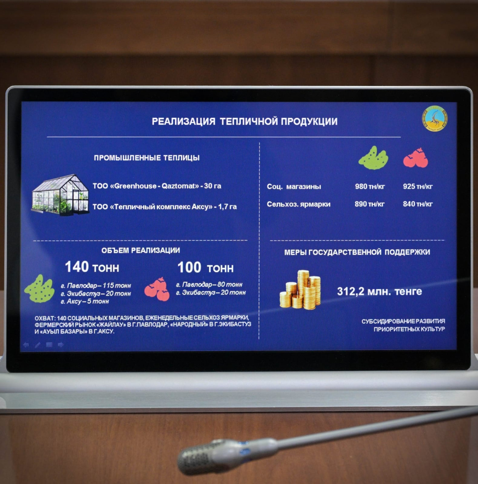 В рамках меморандума тепличные комплексы поставят не менее 140 тонн огурцов и 100 тонн томатов по фиксированным отпускным ценам — 850 и 800 тенге за килограмм соответственно. Розничные цены в социальных магазинах составят 980 тенге за килограмм огурцов и 925 тенге за килограмм томатов, заверили в акимате. На сельхозярмарках продукция будет реализовываться по 890 и 840 тенге.
