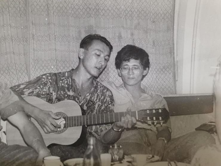 "Причиной тому было наше с Батыром опоздание. В тот раз мы, как обычно, на перемене сидели в одном из "казгушных" закутков, играли на гитаре и так увлеклись, что прозевали звонок. Вбежали в аудиторию, когда лекция уже началась. Преподаватель оглядела нас и гитару с ног до головы, позволила сесть и спросила: "Эта гитара случайно оказалась с вами или вы умеете на ней играть?". И тут наших одногруппников прорвало! Они будто только и ждали этого вопроса: крича и, перебивая друг друга, аудитория начала горячо рассказывать, что мы с Батыром не просто играем да еще и поем. Чувствуя поддержку товарищей, в глазах которых читалось естественное для любого первокурсника желание увильнуть от занятий, мы достали гитару и воодушевленно запели "Across the universe". Премьера прошла успешно. Мы спели еще одну песню, потом еще одну… Вскоре наш битловский репертуар иссяк, и мы, чтоб дотянуть до конца пары, стали петь все подряд", - рассказывает близкий друг Батыра, лидер группы Motor-Roller Ильяс Аутов.