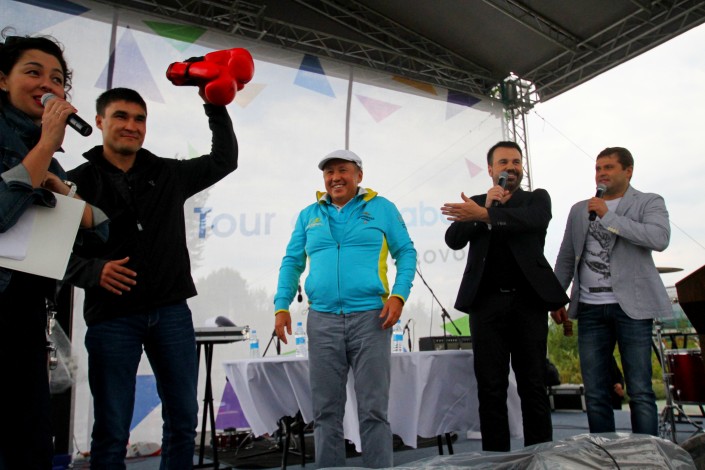 Серик Сапиев вручает свои перчатки победителю Нурлану Смагулову.