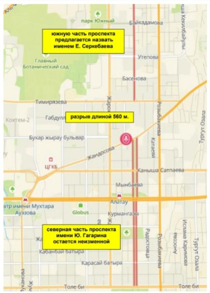 "Как известно, именем первого космонавта, Героя Советского Союза Юрия Гагарина была названа улица с условным названием "13-я линия", основная часть которой находилась в пределах современных улиц Толе би (Комсомольская до 1991 года) и Жандосова (Каргалинское шоссе до 1964 года). Решение было принято Алматинским горисполкомом от 14 апреля 1961 года. Основная, бульварная часть проспекта Гагарина от улицы Толе би прерывается на улице Жандосова и продолжается только через два квартала, или 560 метров. При этом на данном отрезке нет пешеходных или иных путей. Учитывая данное обстоятельство, а также растущее население города, необходимо принять во внимание, что в условиях современных городов усложняется навигация для жителей, гостей и туристов", - заявили в маслихате Алматы.