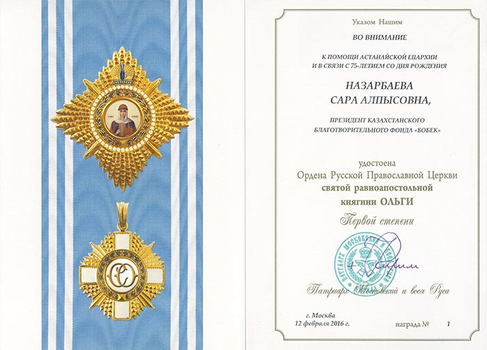 Кроме того, сегодня стало известно, что Патриарх Московский и всея Руси Кирилл наградил Сару Алпысовну орденом святой равноапостольной княгини Ольги I степени. Отмечается, что высокой церковной награды Сара Назарбаева удостоена "во внимание к помощи Астанайской епархии и в связи с 75-летием со дня рождения".