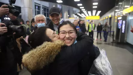В терминале казахстанцев ожидали их родственники с цветами и шариками, а также множество представителей СМИ.