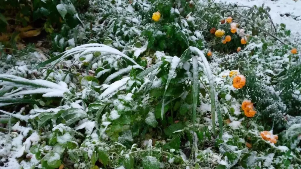 Жители Северо-Казахстанской области делятся в соцсетях фотографиями первого снега, выпавшего в последнюю неделю сентября. Свежий снег покрывает еще зеленые цветы и деревья.