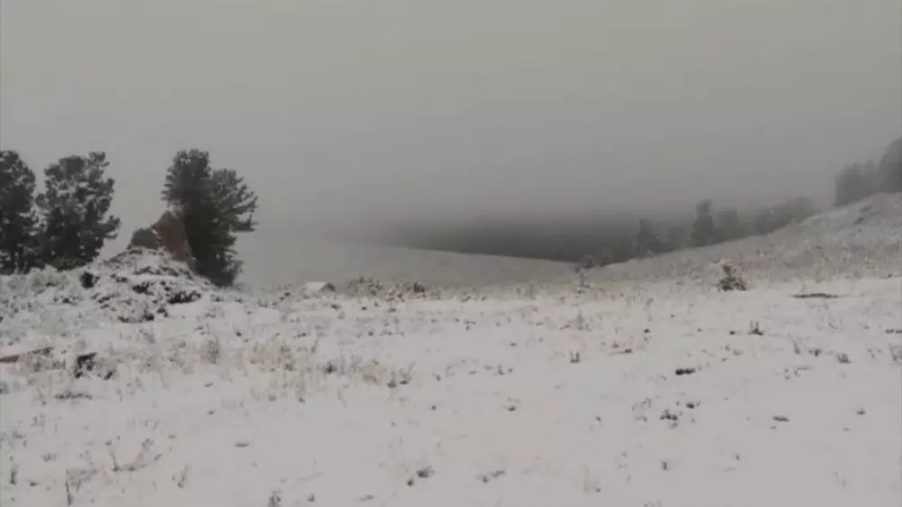 Фотография очевидца Алексея Наконечного, на которой запечатлен первый снег, выпавший в высокогорье Восточного Казахстана, обсуждается в Сети. На высоте 1870 метров, где находится спортивная база, земля плотно покрыта снегом.
