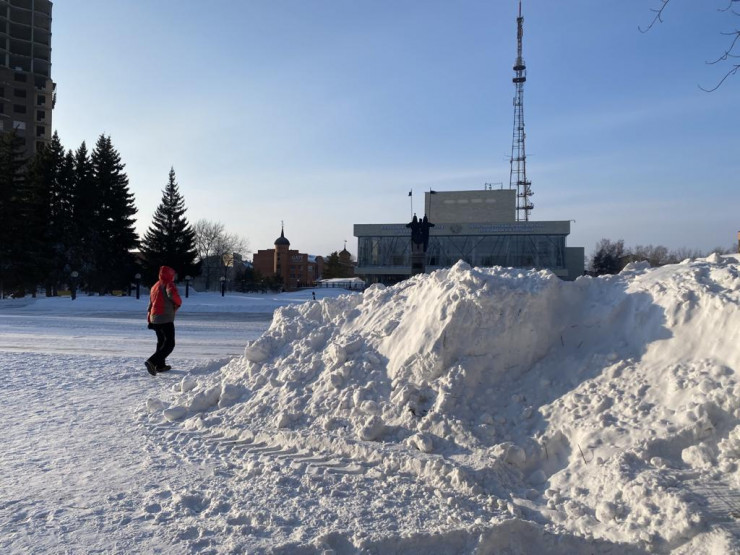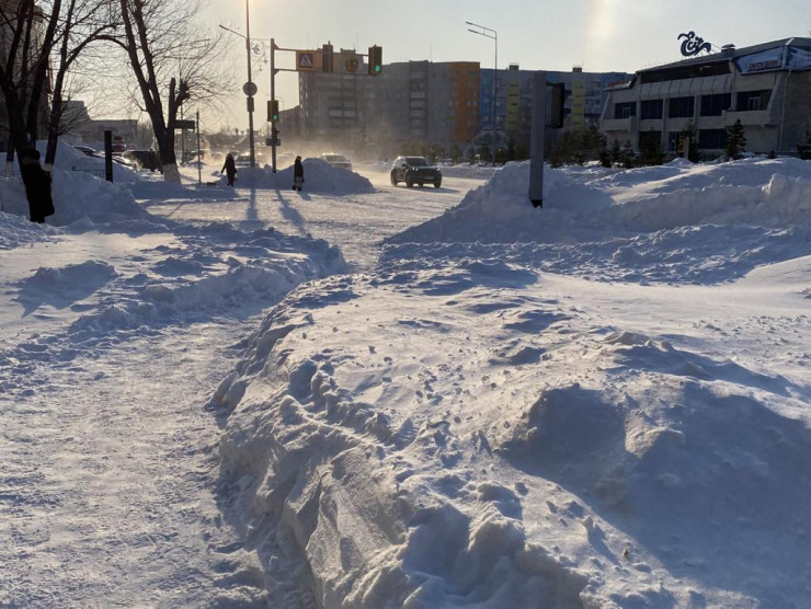 В центре Петропавловска появились двухметровые сугробы на тротуарах. Например, такие "горы" образовались после очистки дорог и тротуаров на улице Пушкина.