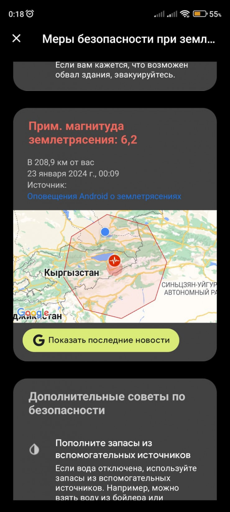 "Действительно, владельцы Android-смартфонов получили уведомление о землетрясении, но только те, кто настроил эту функции. Включается она в настройках. Для этого необходимо зайти в "Настройки", вбить в поиск "землетрясение", выйдет пункт "Оповещение о землетрясениях", который необходимо включить", - напомнил Измайлов.
