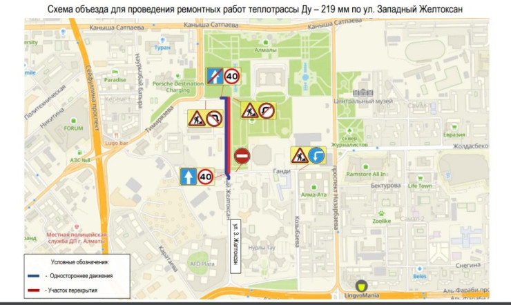 На время ремонтных работ трубопровода ежедневно с 07:00 до 22:00 движение для транспорта по улице Западный Желтоксан будет односторонним в северном направлении. С 22:00 до 07:00 ежедневно и в выходные дни движение будет перекрыто в обе стороны.