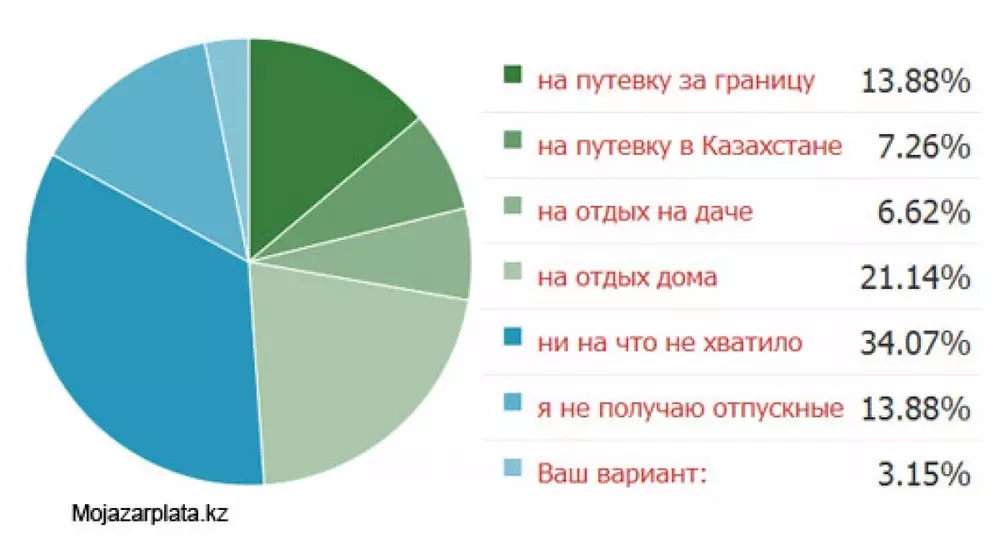 Так, на вопрос "На что хватило отпускных в Казахстане?" 34 процента опрошенных ответили - "ни на что", а еще 21,1 процента сообщили, что на отпускные смогли отдохнуть дома. Более 13 процентов казахстанцев заявили о том, что купили путевку за границу.