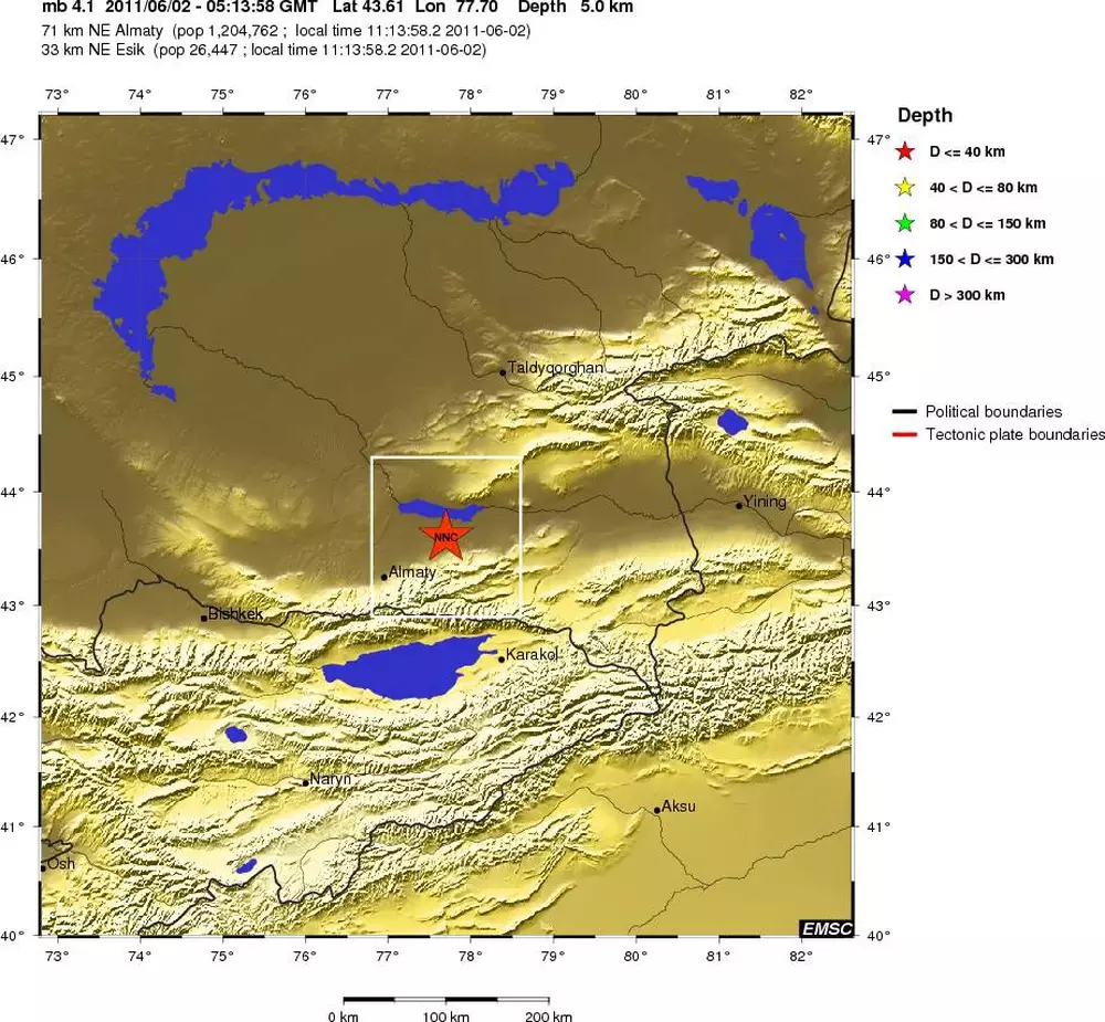 Близ Алматы произошло землетрясение магнитудой 3,8, передает корреспондент Tengrinews.kz со ссылкой на Институт геофизических исследований Национального ядерного центра Казахстана. Подземные толчки были зафиксированы в 70 километрах северо-восточнее Алматы в 11.13 по времени Астаны. Энергетический класс подземных толчков составил 9,0. Землетрясение ощущалось в Алматы с интенсивностью 2 балла, а в Талгаре - 3 балла. Однако, по данным МЧС Казахстана, подземные толчки были зафиксированы в 72 километрах от Алматы. Сведений о возможных разрушениях нет.