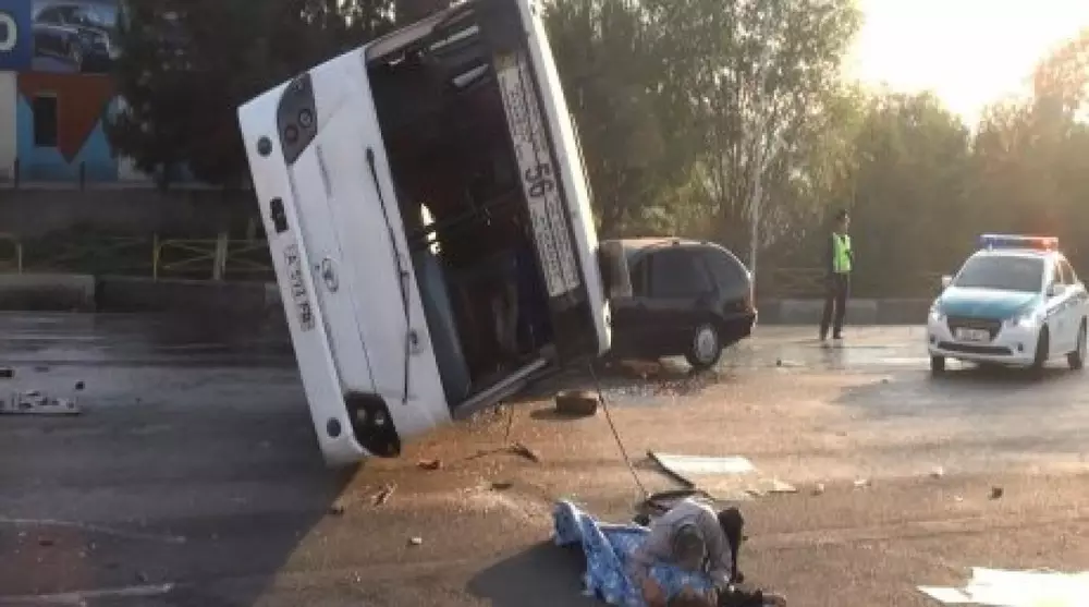 "Полицейскими установлено, что грузовая автомашина марки Volvo (бензовоз) двигалась по улице Палладина в северном направлении, а автобус марки Daewoo, 56-го маршрута, ехал по улице Жумабаева на восток. В результате грубого нарушения правил дорожного движения водителем одного из вышеуказанных транспортных средств произошло столкновение, в результате чего общественный транспорт отбросило на полосу встречного движения, где он столкнулся с автомашиной марки Mercedes, следовавшим по Жумабаева на запад. Погиб один человек - водитель автобуса, еще девять пассажиров с телесными повреждениями различной степени были госпитализированы в больницы города. Между тем, отмечу, что данный перекресток регулируется светофорным объектом. Бензовозом (компании Royal Petrol. - Прим. автора) управлял 48-летний мужчина, а за рулем автобуса находился 49-летний водитель", - сообщила Азирбек.