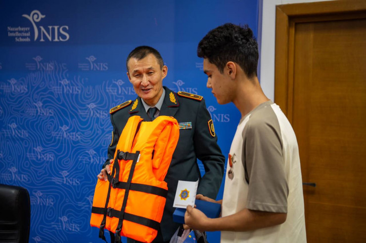 В АОО "НИШ" министр по чрезвычайным ситуациям Сырым Шарипханов наградил ученика NIS Петропавловска Аслана Гималетдинова медалью "За спасение утопающих", который спас тонущего мальчика в СКО. Также подросток получил медаль "Қамқор жүрек".