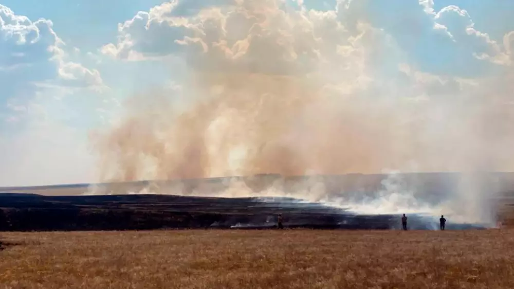 По информации ведомства, военнослужащие пограничного отделения "Бозбие" локализовали очаг пожара, двигавшийся к поселку Волгоградское, где проживает около 30 семей, находится 80 жилых строений и непосредственно пограничное отделение.