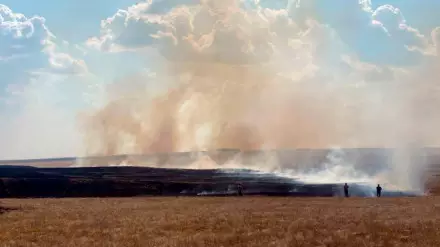 По информации ведомства, военнослужащие пограничного отделения "Бозбие" локализовали очаг пожара, двигавшийся к поселку Волгоградское, где проживает около 30 семей, находится 80 жилых строений и непосредственно пограничное отделение.