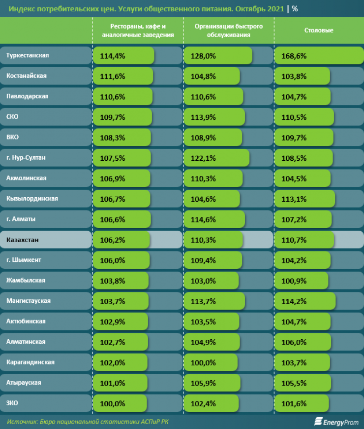 Согласно представленным данным, в годовой динамике наибольший рост цен был зарегистрирован в Туркестанской области: сразу на 37 процентов. Заметно подорожал общепит также в столице (на 11,4 процента) и в Северо-Казахстанской области (на 11 процентов). Наименьший рост цен зафиксирован в Западно-Казахстанской области: на 1,2 процента.