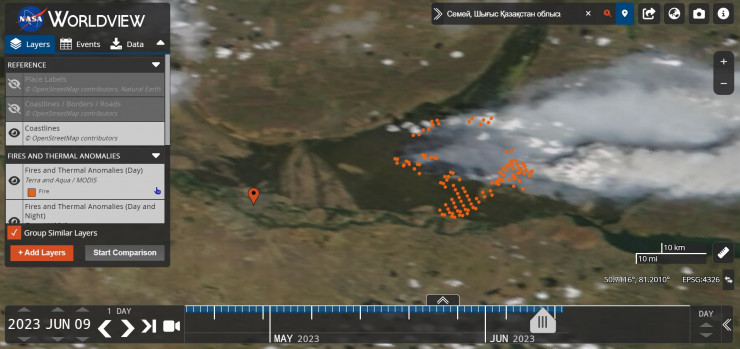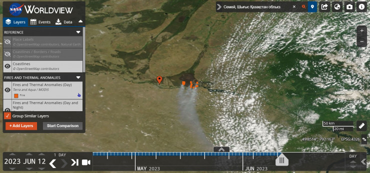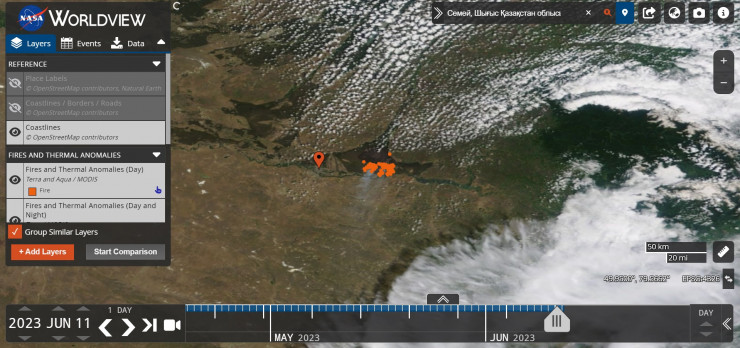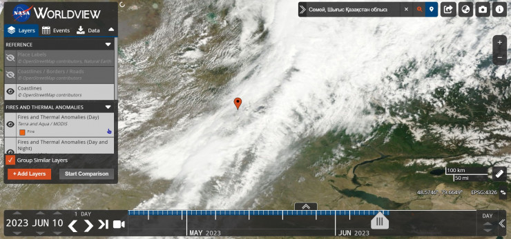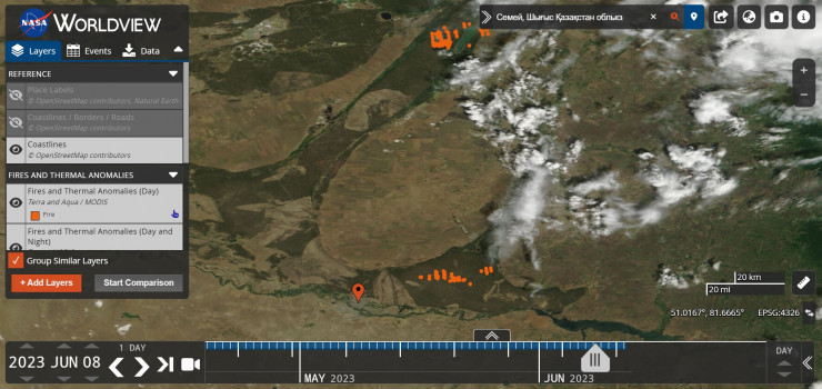 Для получения снимков из космоса мы обратились к сервису NASA Worldview, который позволяет просматривать актуальные снимки каждой точки Земли. Эти космические снимки предоставляют обзор всей территории области Абай, затронутой пожаром, благодаря чему можно получить полное представление о его масштабах. По последним данным, площадь возгорания составляет около 43 тысяч гектаров.