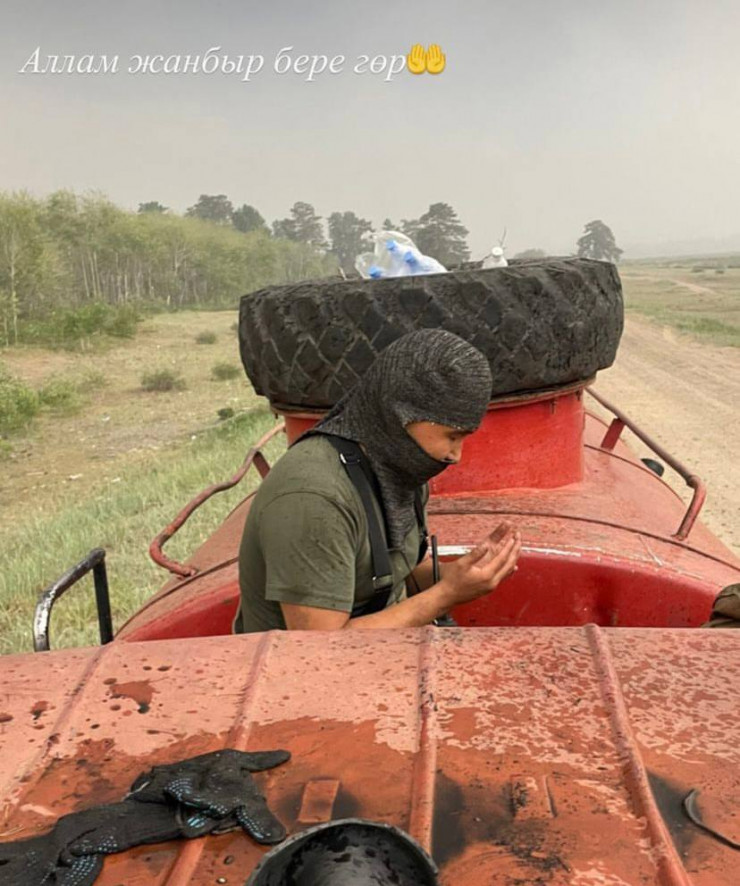 Кадрами от первого лица у себя на странице в Instagram делится пожарный Елдос Нуртазаев. На разлетевшемся по сети фото изображен его коллега, который молится о наступлении дождя в области. По всей видимости, молодые люди везут воду на место пожара.