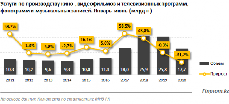 Объем услуг по производству кино- и видеофильмов, телепрограмм, фонограмм и музыкальных записей за первое полугодие составил 17,7 миллиарда тенге - на 31,2 процента меньше по сравнению с аналогичным периодом прошлого года.