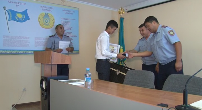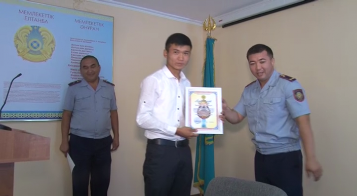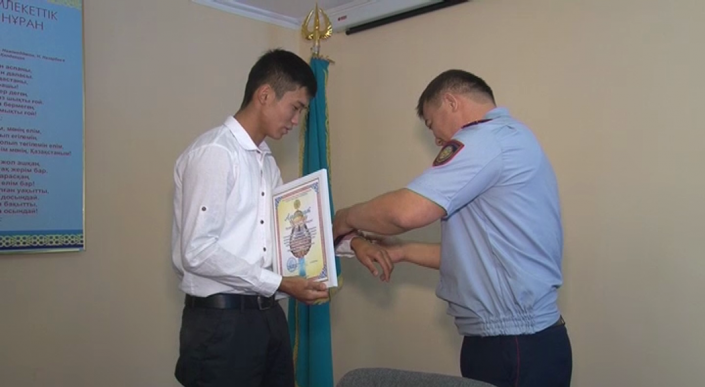 За проявленное мужество, гражданскую сознательность и оказанную помощь в задержании преступника заместитель начальника Сайрамского РУВД, подполковник полиции Бауыржан Жанаев в торжественной обстановке вручил Айбату Маутанбекову благодарственное письмо и ценные подарки.