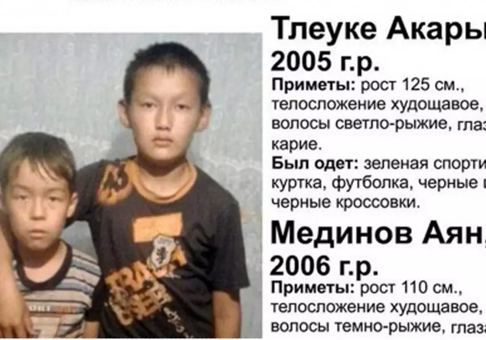 Напомним, 11-летний Акарыс Тлеуке и 10-летний Аян Мединов пропали 6 июля в поселке Актас, Карагандинской области. По информации волонтеров, в полицию заявление о пропаже детей подал отец. Ребята играли и ушли со двора в первую половину дня. После этого их никто не видел.