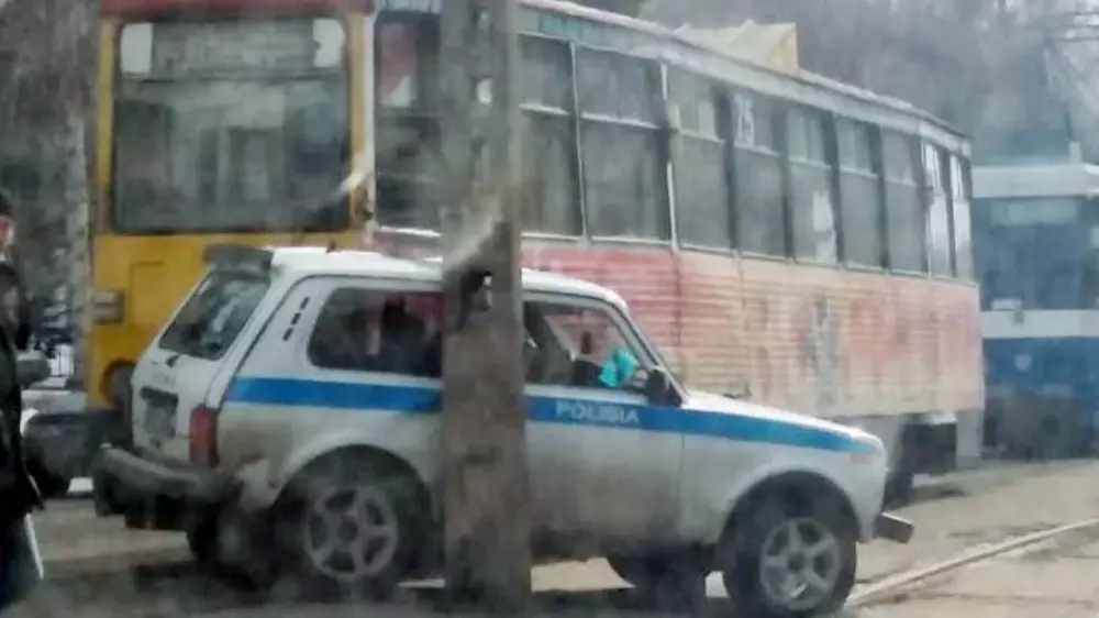 Патрульный автомобиль столкнулся с трамваем в Усть-Каменогорске и парализовал движение транспорта, передает корреспондент Tengrinews.kz.