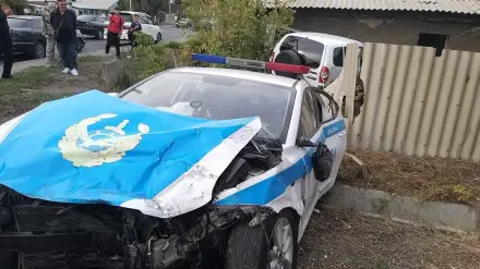 Судя по снимкам, патрульное авто врезалось в ограждение частного дома.