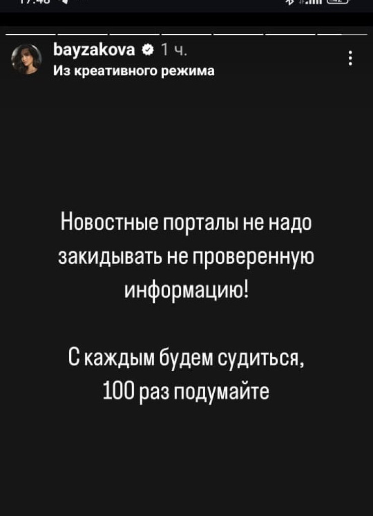 Сама Айжан Байзакова уже отреагировала на информацию в социальных сетях, разместив сторис с предупреждением.