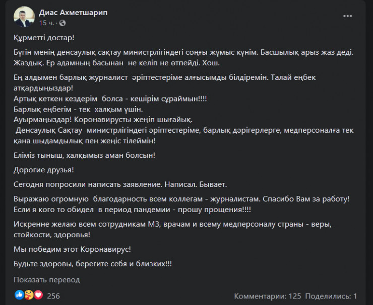 "Дорогие друзья! Сегодня попросили написать заявление. Написал. Бывает. Выражаю огромную благодарность всем коллегам - журналистам. Спасибо вам за работу! Если я кого-то обидел в период пандемии - прошу прощения! Искренне желаю всем сотрудникам МЗ, врачам и всему медперсоналу страны веры, стойкости, здоровья! Мы победим этот коронавирус! Будьте здоровы, берегите себя и близких!" - написал он на своей странице в Facebook.