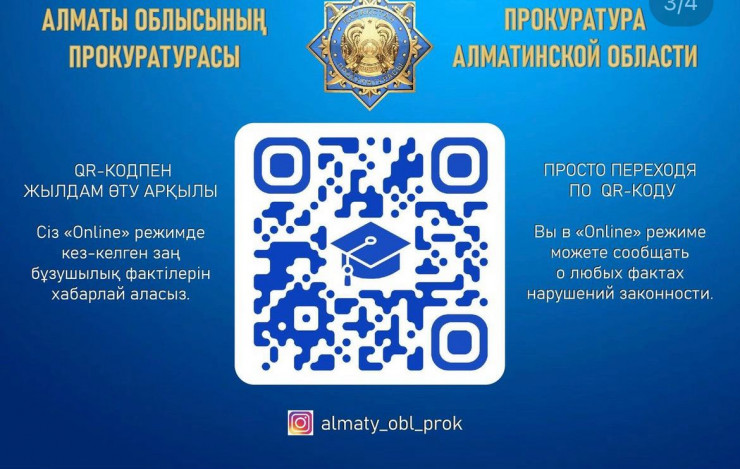 "Стоит отметить, во всех учреждениях образования размещен QR-код прокуратуры Алматинской области, с помощью которого граждане могут сообщить о всех имеющихся фактах различного рода правонарушений, сигнал о которых незамедлительно поступает прокурорам, которые в свою очередь принимают меры в соответствии действующим законам", - добавили прокуроры.