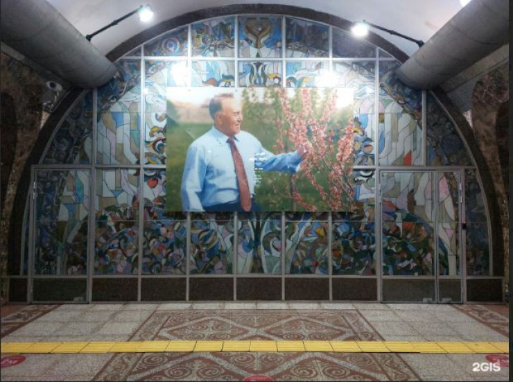 Отметим, что фотография Назарбаева встречала пассажиров на входе в станцию с момента ее запуска 1 декабря 2011 года. Ее установили поверх витражного панно "Алмалы" работы художников Газиза Ешкенова и Айдара Жамхана. Панно из цветного стекла изображает цветущую яблоню. На фотографии бывший президент также смотрел на ветку яблони.