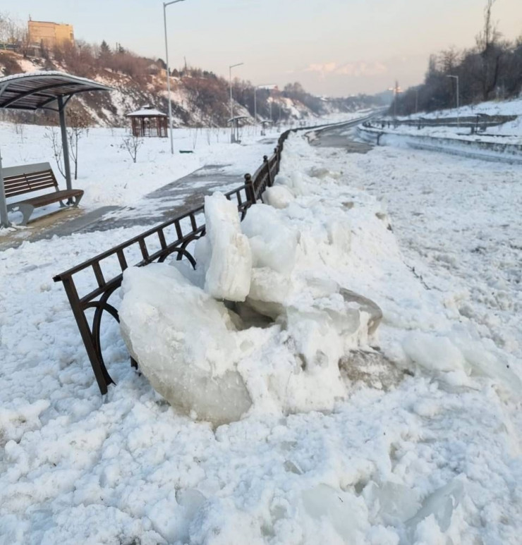 После таяния льда ниже по реке в большом объеме поплыли ледяные глыбы (шугоход), которые повредили ограждения набережной зоны на участке между улицей Жамакаева и проспектом Аль-Фараби.