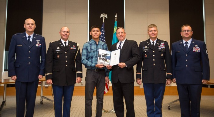 Посол США в Казахстане Джордж Крол вручил памятную монету и сертификат казахстанцу Алмасу Байшану, поступившему в американскую военную академию, передает корреспондент Tengrinews.kz со ссылкой на официальную страницу посольства в социальной сети Facebook.