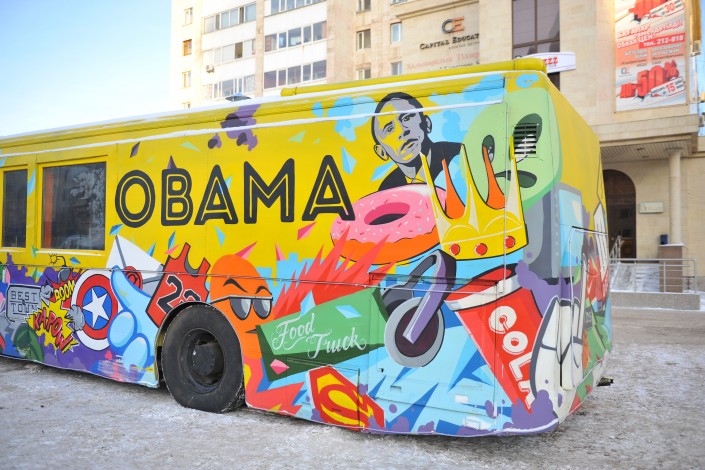 "Для Астаны трех фуд-траков хватает, я думаю. Они будут установлены в проходимых, многолюдных местах. Мы запустим первый автобус, скорее всего, в течение двух дней", - рассказал владелец автобуса с изображением Обамы Нурсултан Шарипбаев.