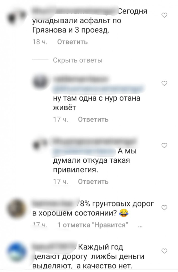 "Где вы нашли 78 процентов удовлетворительных дорог? Может быть, неудовлетворительных. Вы точно в Семее дороги смотрели?" - пишут под постом Сактаганова.