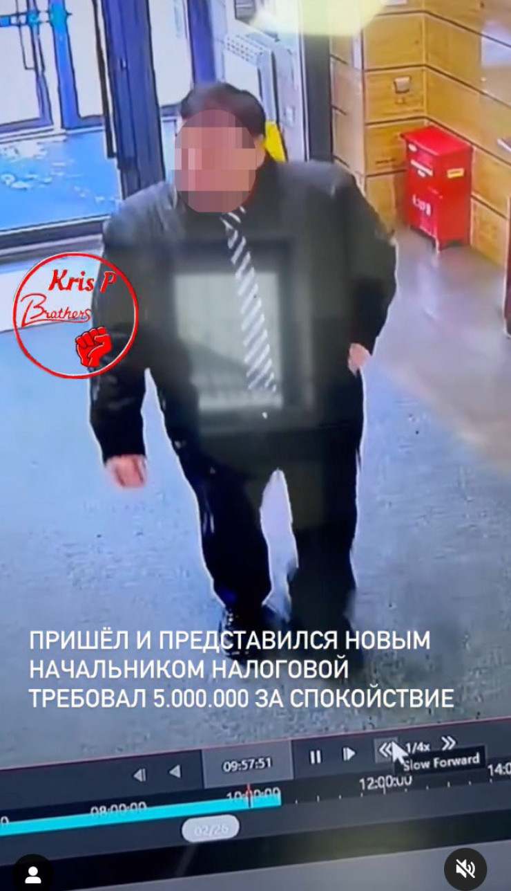 "Сегодня в Алматы в 9:45 утра в офис компании зашел мужчина лет 50 в костюме и, не представляясь, стал здороваться в кабинете с сотрудниками компании, после приветствия обратился лично ко мне по Ф. И. О., после чего попросил выйти отдельно в другой кабинет, в дверях он сказал, что ранее он был начальником налоговой службы по Турксибскому району, а теперь его повысили и он стал начальником города Алматы. Сказал, что выезжает в Астану на представление с начальником ДВД, и за покровительство начал вымогать 5 миллионов тенге!" - сообщил автор видео.