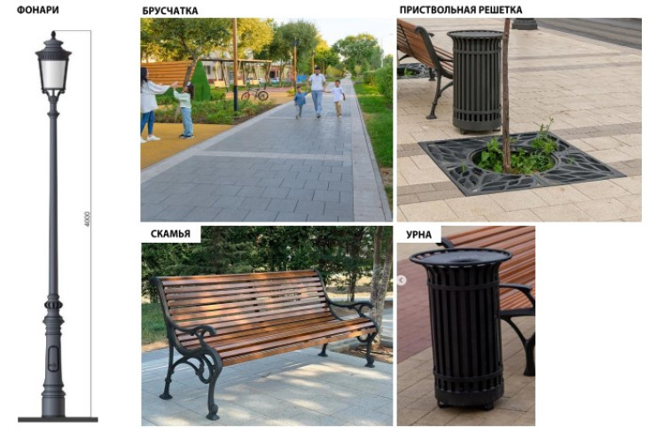 Таковы эскизы фонарей, скамьи, тротуаров и урн.