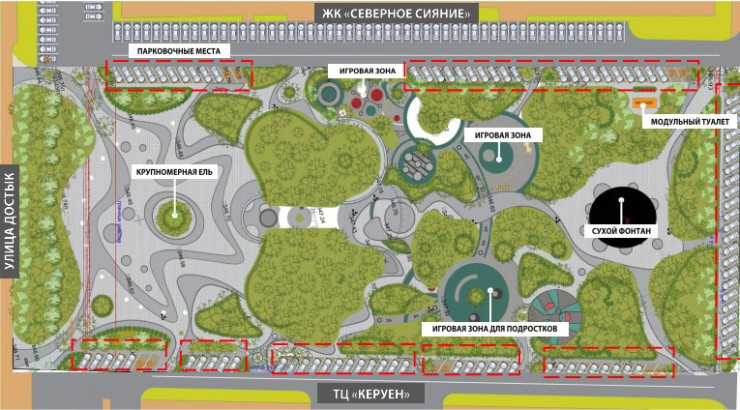 На первом эскизе можно увидеть, где будут расположены игровые зоны, сухой фонтан, туалет и парковочные места.