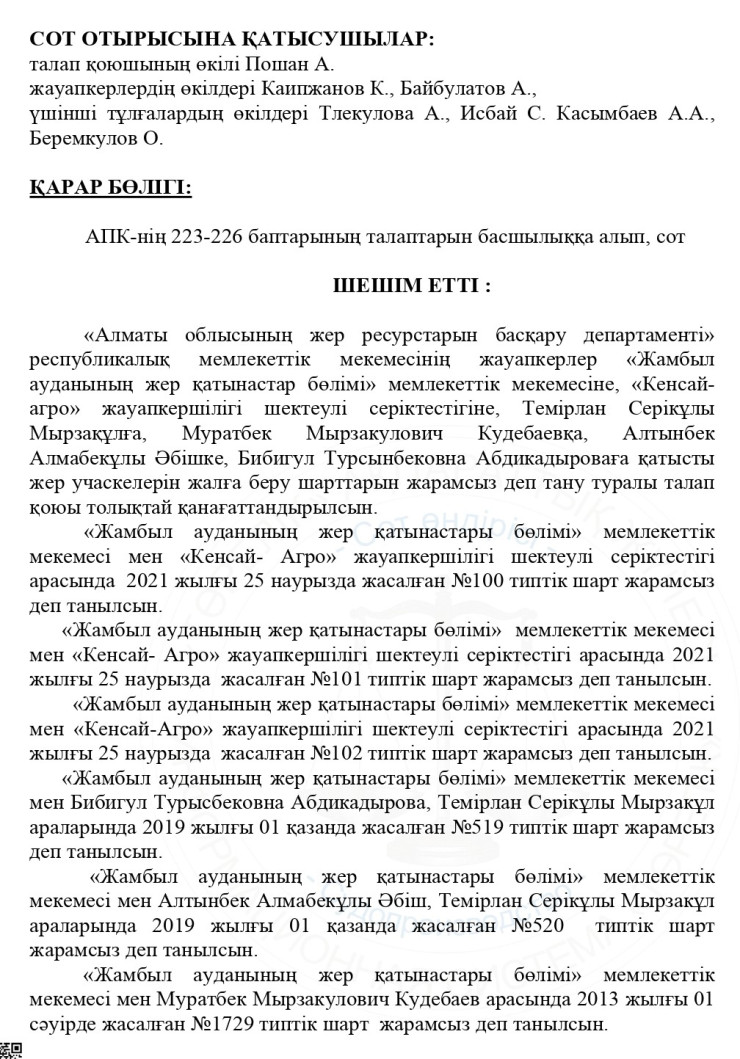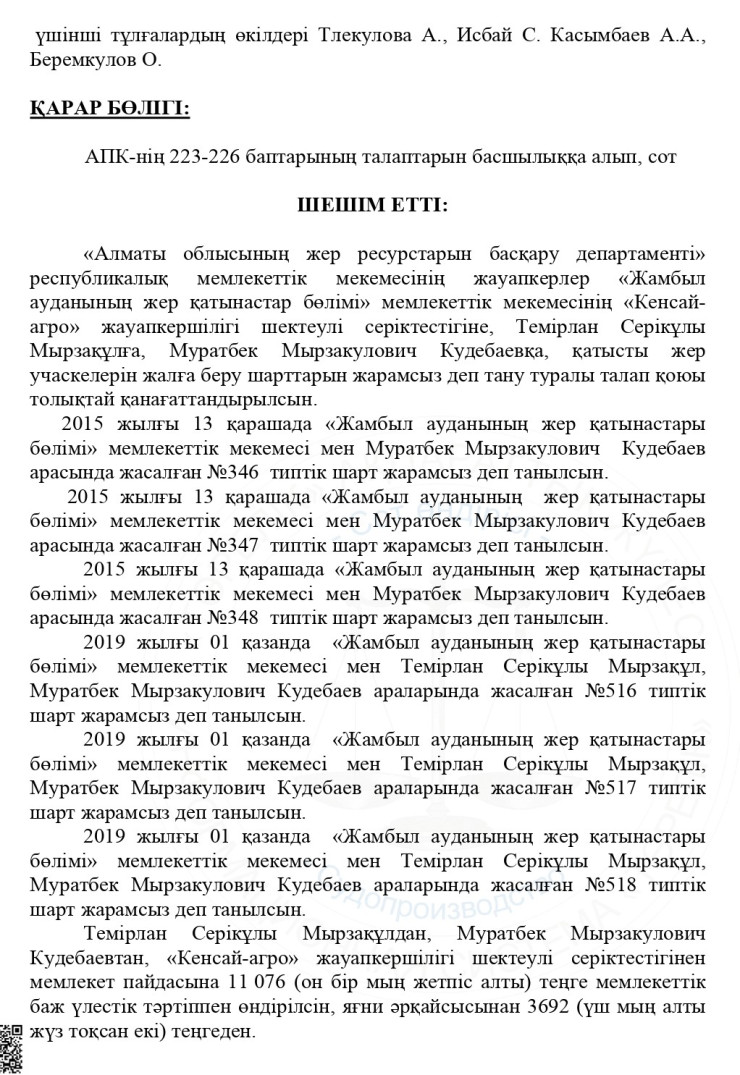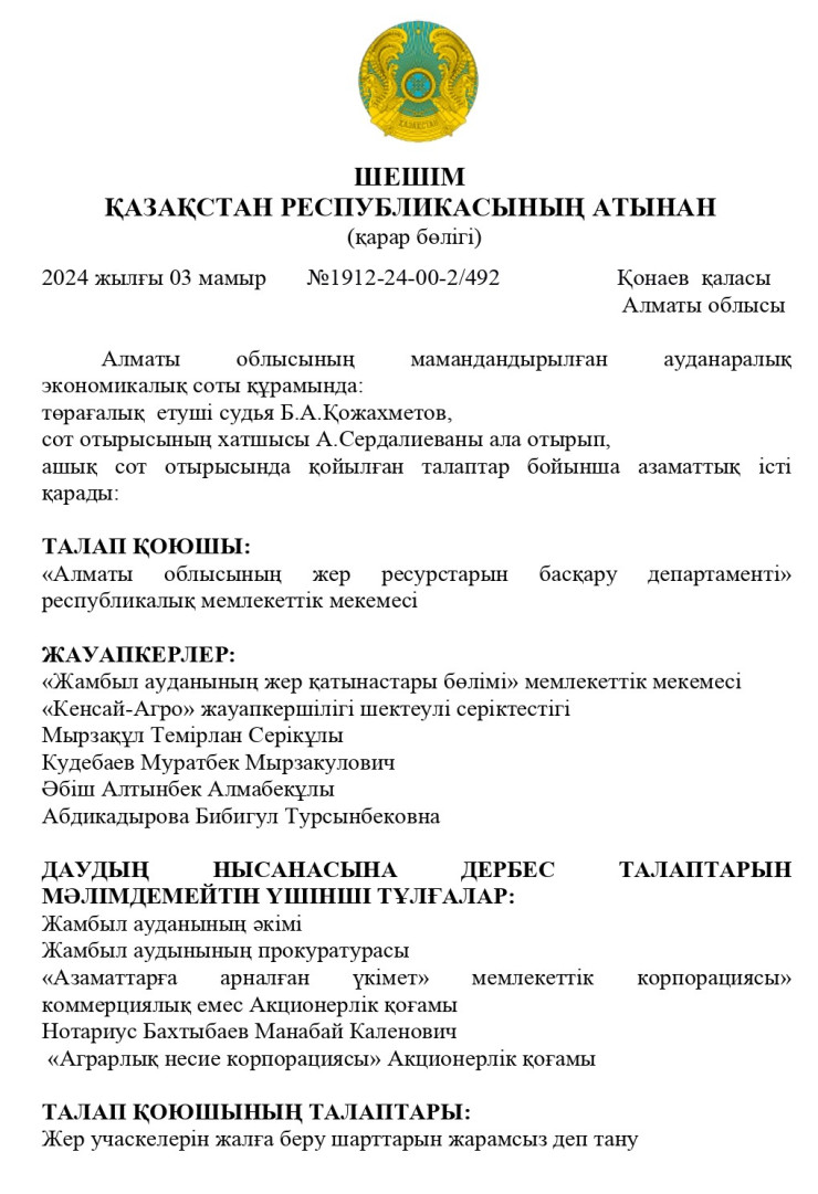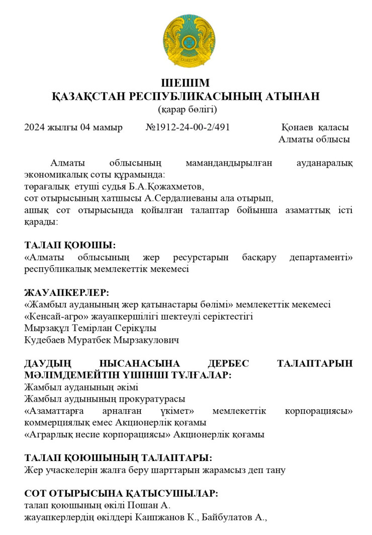 Иск к ТОО "Кенсай-Агро" и нескольким физическим лицам, в числе которых Темирлан Мырзакул и Муратбек Кудебаев, подал Департамент по управлению земельными ресурсами Алматинской области. Он требовал признать утратившими силу условия аренды земельных участков.