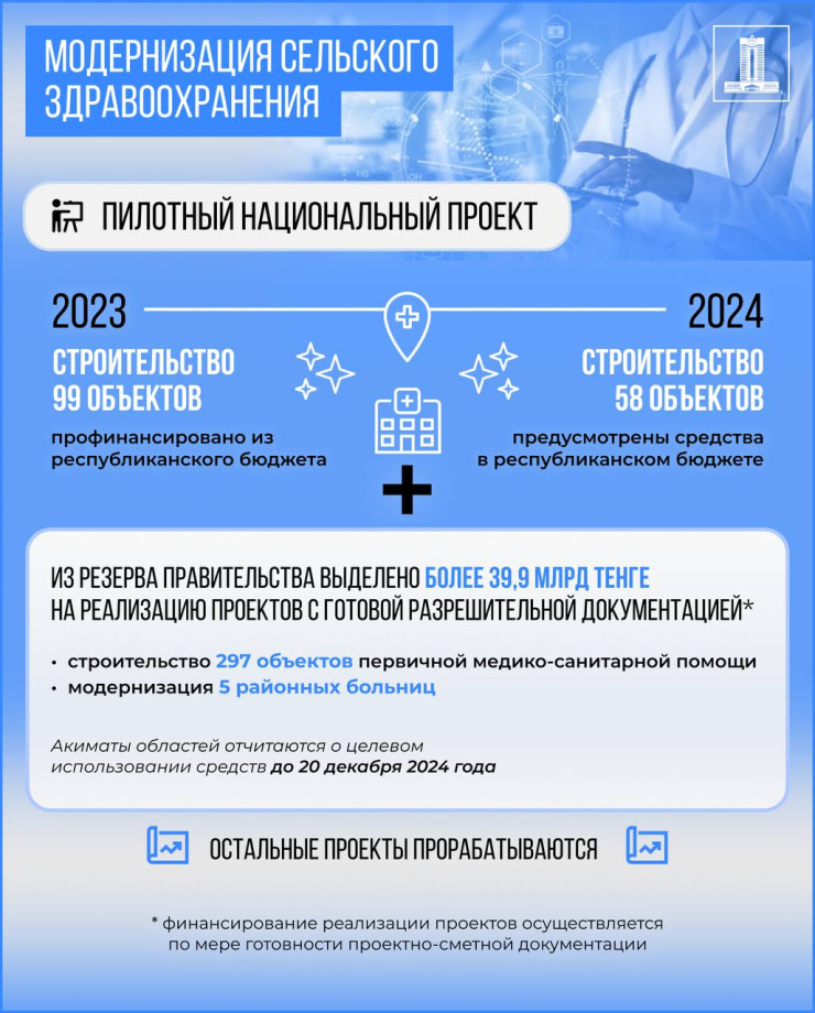 Финансирование проектов осуществляется согласно поданным заявкам от акиматов регионов по мере готовности проектно-сметной документации. В этой связи средства из резерва правительства в размере чуть более 39 миллиардов 987 миллионов тенге будут направлены на строительство 297 объектов первичной медпомощи в сельских населенных пунктах, по которым готова ПСД. Среди них медпункты, фельдшерско-акушерские пункты и врачебные амбулатории.