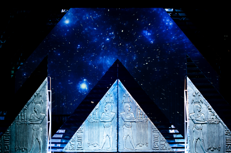 Футуристическое видение сцены- декорации, костюмы героев и видеографика погрузят зрителя в сюрреалистичный мир, а ведущие солисты оперной труппы на большой сцене тетра исполнят космических масштабов драму и создадут аллюзию Древнего Египта. Звуки симфонического оркестра передадут гамму чувств и переживаний, что разворачивается в душе каждого из героев.