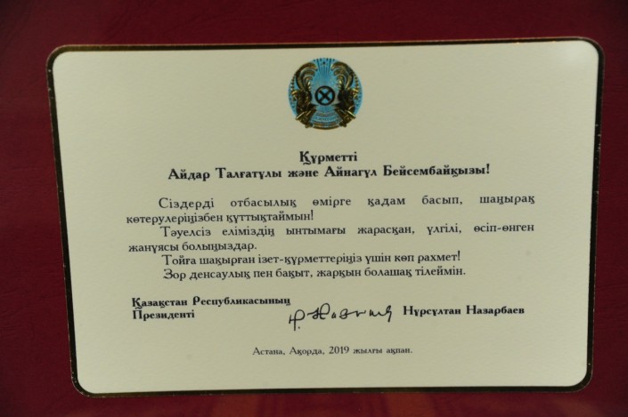 Аким Астаны Бахыт Султанов передал молодоженам письмо с поздравлением от Главы государства. По словам акима, Президент был глубоко тронут письмом молодого человека и поздравил семью Айдара и Айнагуль Сулейменовых с началом семейной жизни.