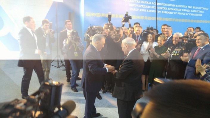 Президент РК в ходе внеочередной XXIII сессии Ассамблеи народа Казахстана подарил свои часы ветерану войны, сообщает корреспондент Tengrinews.kz.