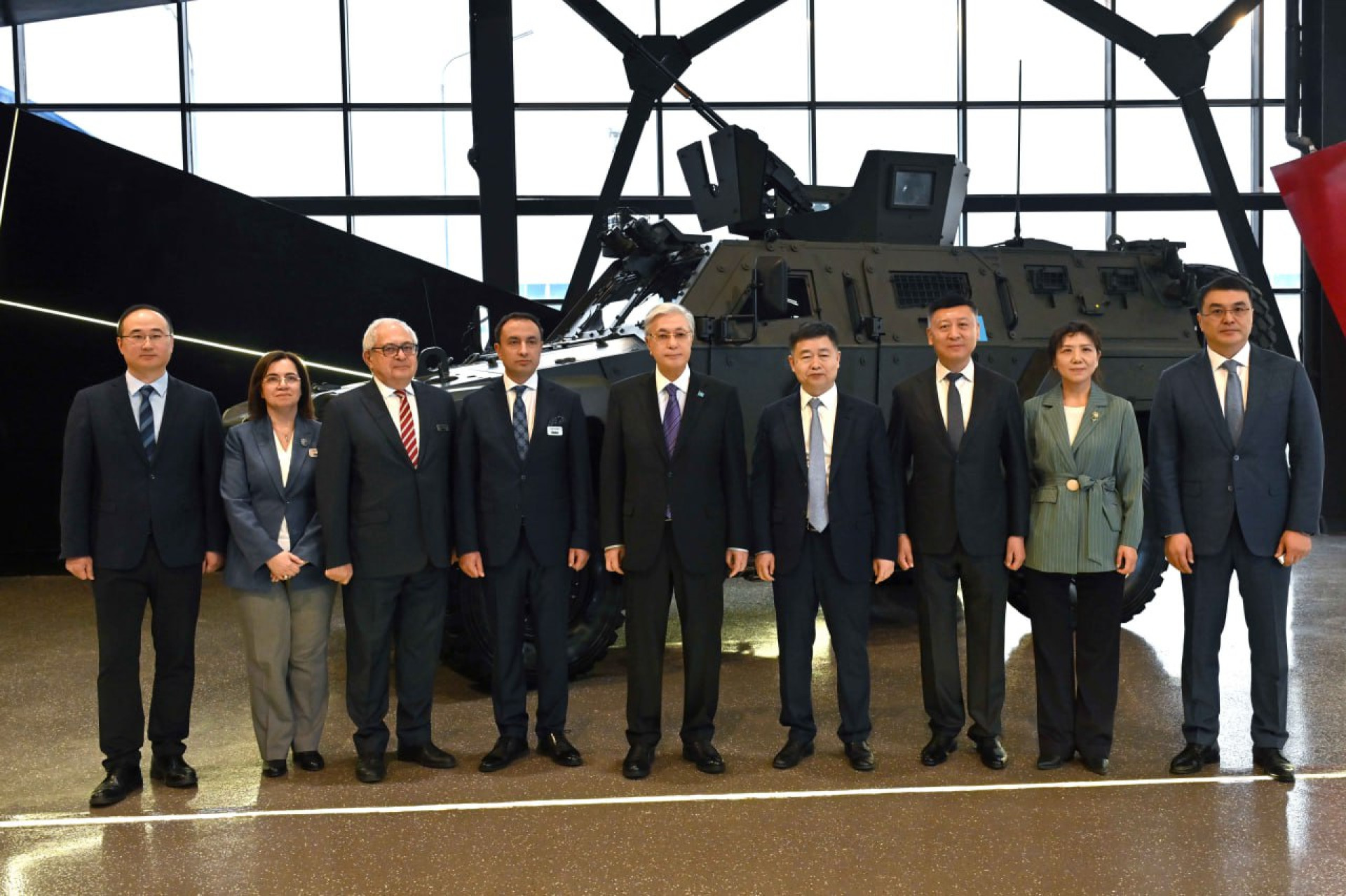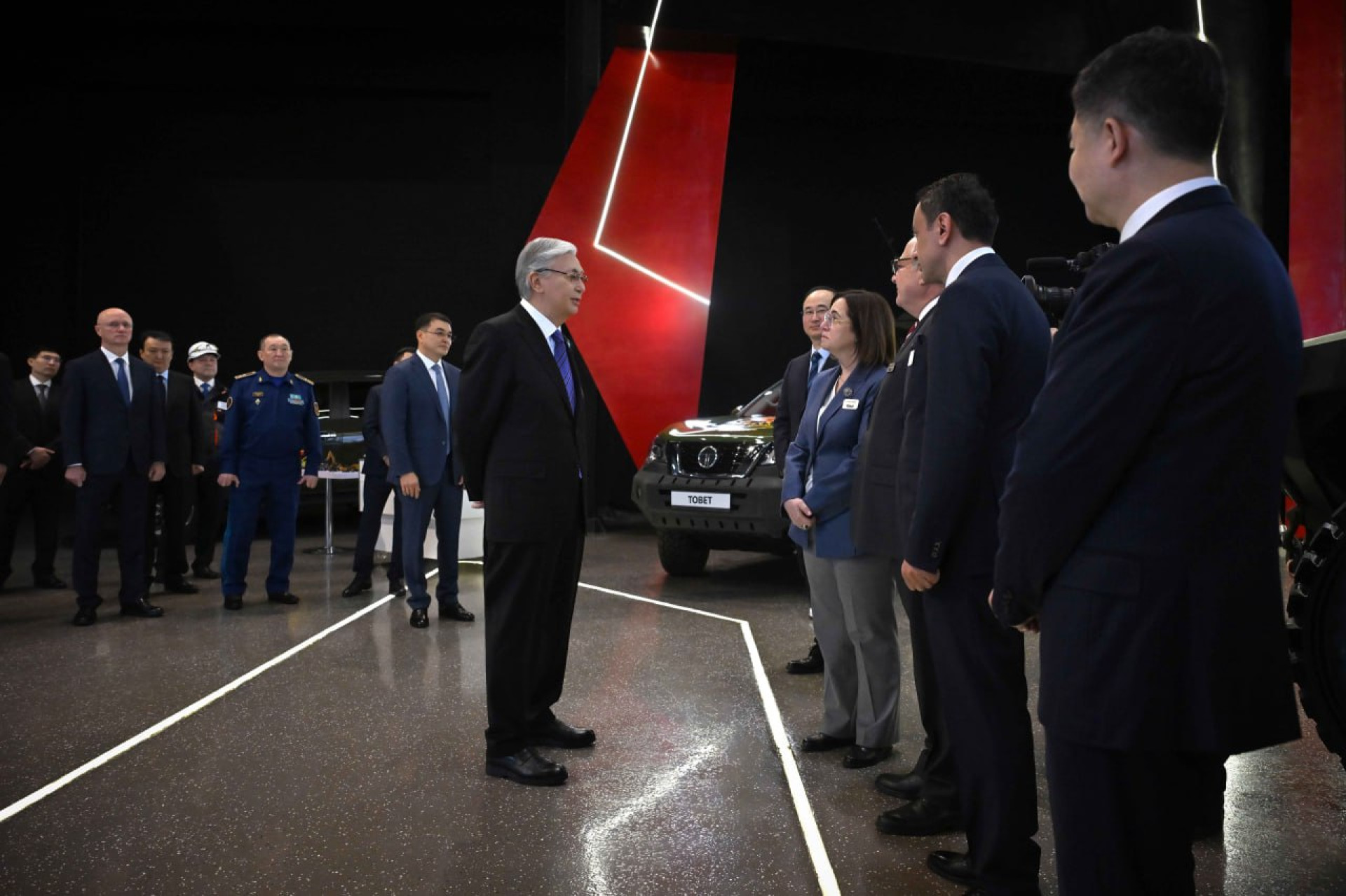 "Касым-Жомарт Токаев осмотрел производственные цеха и сборочные этапы, ознакомился с технологическим процессом и производственными возможностями предприятия оборонно-промышленного комплекса. Компания выпускает до 200 единиц плавающих колесных бронемашин Taimas 8 x 8, Aibar 4 x 4, а также гусеничной техники Tulpar", - отмечает пресс-служба Акорды.