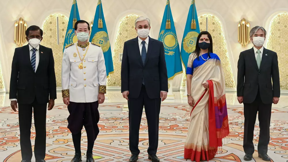 Верительные грамоты вручили посол Японии Джун Ямада, посол Индии Шубдаршини Трипати, а также послы по совместительству - посол Камбоджи Ким Хенг Миэ и посол Шри-Ланки Мигахаланде Дураге Ламаванса.