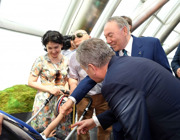 В ходе посещения президенты двух стран ознакомились с экспозициями национального павильона Финляндии и осмотрели выставочный павильон Казахстана, расположенный в комплексе "Нур Алем".