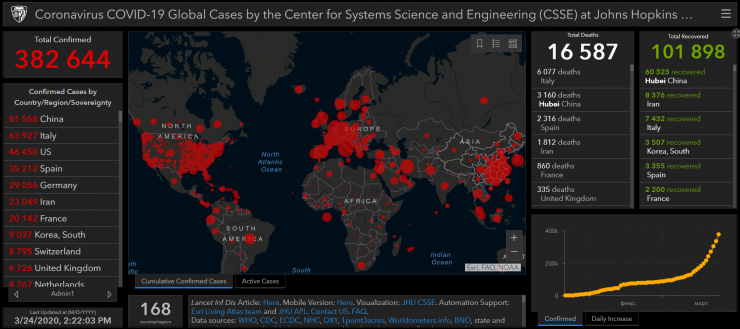 По данным исследователей американского университета Джона Хопкинса, коронавирусная инфекция зарегистрирована у 282,6 тысячи человек в 168 странах. Скончались от болезни более 16 тысяч человек. Почти 102 тысячи официально выздоровели после заражения.