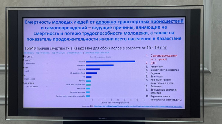 "Однако более глубинная оценка преждевременной смертности и потерь продолжительности жизни с использованием показателей потенциально потерянных лет жизни, скорректированных по нетрудоспособности, и данных глобального исследования бремени заболеваний показывает, что смертность молодых людей от дорожно-транспортных происшествий, самоповреждений является двумя ведущими причинами потерь численности, трудоспособности молодежи, а также сдерживает рост показателя продолжительности жизни всего населения в Казахстане.