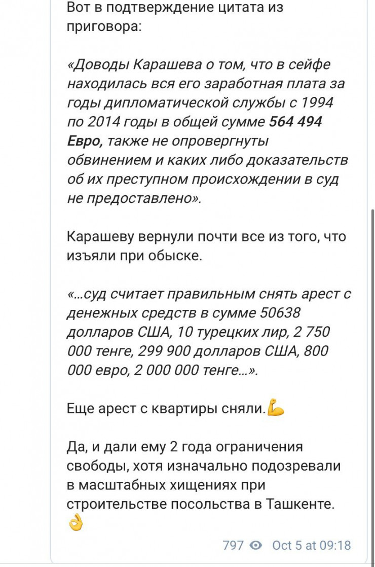 В дальнейшем в отношении Карашева рассматривалось дело в части хищения денег на строительство посольства и НДС. Факт хищения денег судом не установлен, поэтому действия Карашева переквалифицированы на злоупотребление должностными полномочиями. Приговором суда № 2 района Байқоңыр Нур-Султана от 18 сентября 2020 года ему назначено два года ограничения свободы. Приговор в законную силу не вступил. Стороны, в том числе прокурор, вправе его обжаловать", - сообщили в пресс-службе.