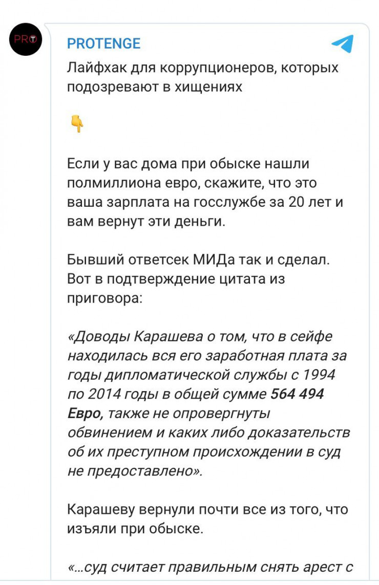 "Если у вас дома при обыске нашли полмиллиона евро, скажите, что это ваша зарплата на госслужбе за 20 лет, и вам вернут эти деньги. Бывший ответсек МИДа так и сделал", - написал автор поста.